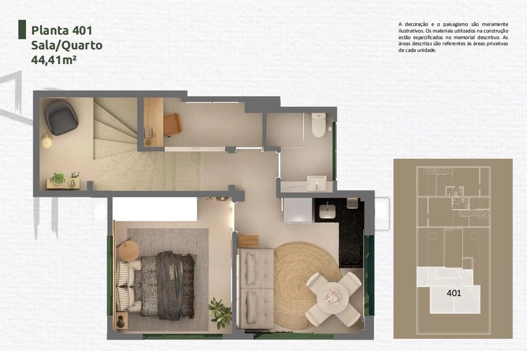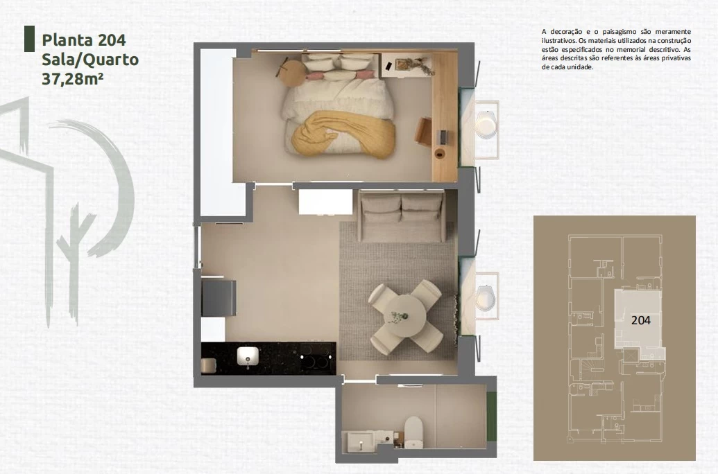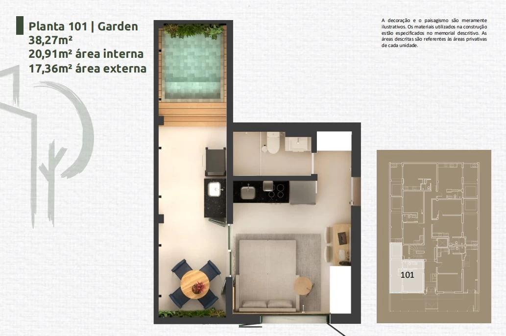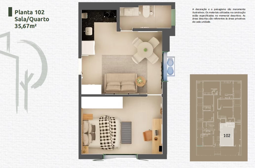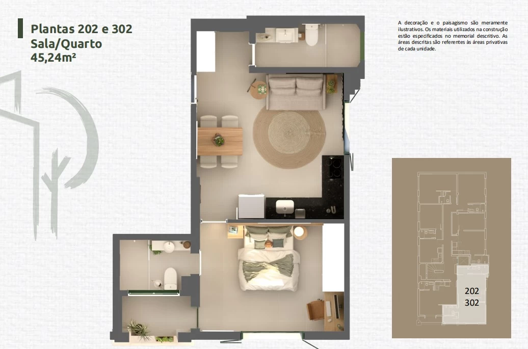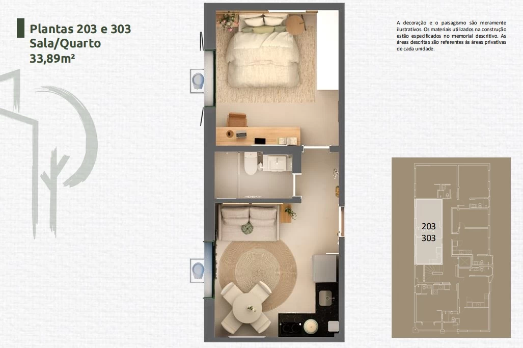 Apartamento de 1 Quarto de 33,89m² a 45,24m².